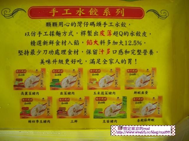 目前共有8種口味:高麗菜豬肉、韭菜豬肉、玉米蔬菜豬肉、鮮蝦韭黃、辣四季豆豬肉、三鮮、豆苗豬肉、杏鮑菇鮮蝦等。